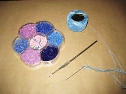 Empezamos mezclando todas las mostacillas en tonos azules y ensartándolas en el hilo del ovillo.