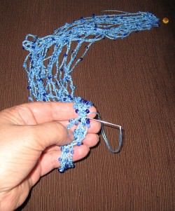 Luego he ido tejiendo la cadeneta. Cada cinco puntos de cadeneta subía por el hilo una mostacilla y la dejaba enganchada en el punto.