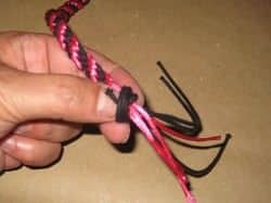 Utilizando uno de los cordones dar dos o tres vueltas alrededor de los otros cordones y del dedo con el que estáis sujetando el trenzado.
