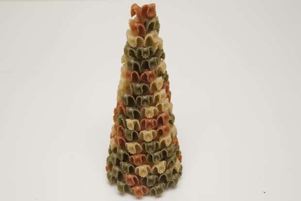 Utilizando la pistola de silicona caliente se van pegando las piezas de pasta alrededor del cono empezando por la base.
