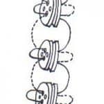 Hay que empezar por enganchar los dos hilos de nylon en uno de los extremos del cierre y a partir de aquí, colocando juntos dos botones iguales, vamos pasando los hilos por dos de los agujeros de los botones, de manera que se vayan cruzando.