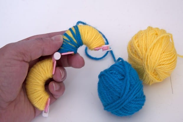 Podemos mezclar lanas de diferentes colores para hacer pompones con dibujos. Este pompón se ha hecho enrollando primero lana amarilla y luego lana azul